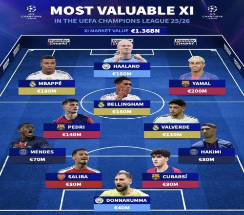 截至北京時間2025年9月18日,德國轉(zhuǎn)會市場的估值顯示:2025/26賽季歐冠“最具身價11人”總身價高達13.6億歐元。鋒線由姆巴佩、哈蘭德、亞馬爾領(lǐng)銜;中場坐鎮(zhèn)的是貝林厄姆、佩德里、巴爾韋德;后防由薩利巴、庫巴爾西、哈基米、努諾·門德斯組成,門將為多納魯馬。下文小編將按位置逐一呈現(xiàn)并做實力評估。