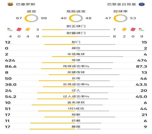 射正73遙遙領(lǐng)先!大巴黎創(chuàng)造機(jī)會(huì)、控球率等皆優(yōu)于巴薩
