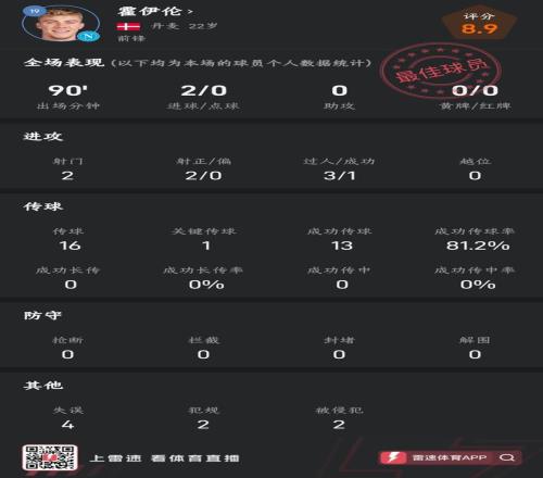 雷速體育10月02日報道宣稱 25-26賽季歐冠聯(lián)賽階段第二輪,意甲冠軍那不勒斯坐鎮(zhèn)主場2-1戰(zhàn)勝葡超冠軍葡萄牙體育,從而奪取本賽季歐冠首場勝利。那不勒斯能斬獲勝利,丹麥前鋒霍伊倫發(fā)揮了決定性作用,包辦球隊全部2粒入球。
