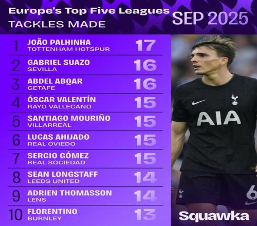 當(dāng)?shù)貢r(shí)間10月1日,知名數(shù)據(jù)機(jī)構(gòu)Squawka發(fā)布了五大聯(lián)賽九月份鏟球榜,熱刺中場(chǎng)帕利尼亞以17次鏟球位居榜首。