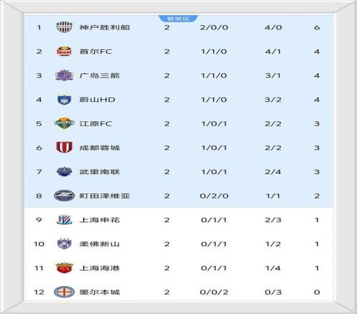 神戶勝利船以2戰(zhàn)全勝積6分躍居榜首,兩連敗的墨爾本城0分墊底。