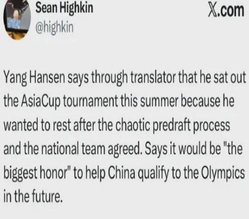 此前楊瀚森在開拓者新賽季媒體日接受采訪時(shí),表示:“未來若能幫助中國男籃重返奧運(yùn)會,將會是他的最大榮譽(yù)?!?/p>