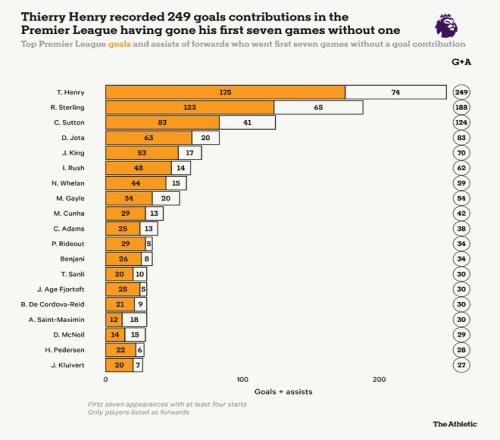 共有75名前鋒(為了公平起見(jiàn),我們排除了中場(chǎng)和后衛(wèi))達(dá)到了“007”的標(biāo)準(zhǔn)(在他們的前七場(chǎng)比賽中至少首發(fā)四次),下表列出了英超總進(jìn)球參與數(shù)排名前20的球員。