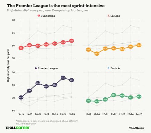 SkillCorner的追蹤數(shù)據(jù)顯示,每場(chǎng)比賽,英超中的高強(qiáng)度跑動(dòng)(速度超過(guò)每小時(shí)20公里/12.4英里)次數(shù)比西班牙、德國(guó)和意大利的頂級(jí)聯(lián)賽更多。