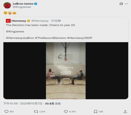 北京時間10月7日晚11點左右,詹姆斯提前一個小時公布自己的決定,他沒有宣布退役,也跟亞馬遜無關,而是發(fā)了另一個廣告。詹姆斯穿上當年加盟熱火的襯衫,他在視頻中表示,自己決定將天賦帶給軒尼詩(著名白蘭地品牌)。
