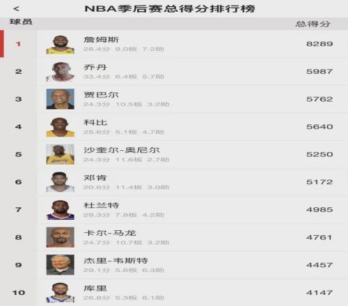 詹姆斯季后賽出場數、出場時間、總得分、總搶斷、總出手、總進球、總打鐵、總罰球、總失誤等多項數據,均是歷史第一。季后賽三雙次數和總助攻數均是歷史第二,兩雙次數和三分命中數均是歷史第三,總籃板歷史第四。