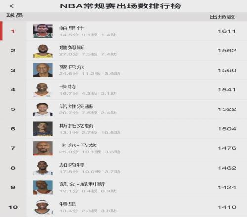 截至目前,詹姆斯已經打了1562場常規(guī)賽,距離羅伯特-帕里什的歷史紀錄(1611場)僅差49場。常規(guī)賽總出場時間、總得分、總出手、總失誤和打鐵數,均是歷史第一。運動戰(zhàn)進球數和罰球命中數,均是常規(guī)賽歷史第二。