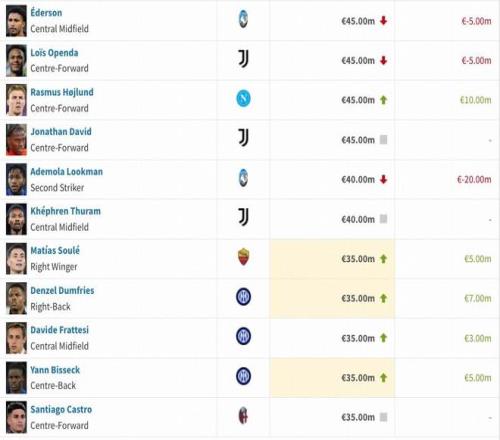 本期德轉(zhuǎn)意甲身價(jià)更新中,上漲最多的是尤文新星伊爾迪茲,身價(jià)上漲2500萬(wàn)歐,科莫隊(duì)的尼科-帕斯身價(jià)上漲了2000萬(wàn)歐。下跌最多的則是亞特蘭大前鋒盧克曼,下跌了2000萬(wàn)歐。