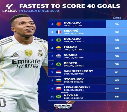 北京時間10月8日,來自德轉(zhuǎn)的統(tǒng)計(jì)指出,姆巴佩成為了自1990年以來,在西甲聯(lián)賽達(dá)成40球大關(guān)所用場次第二少的球員,僅次于C羅。