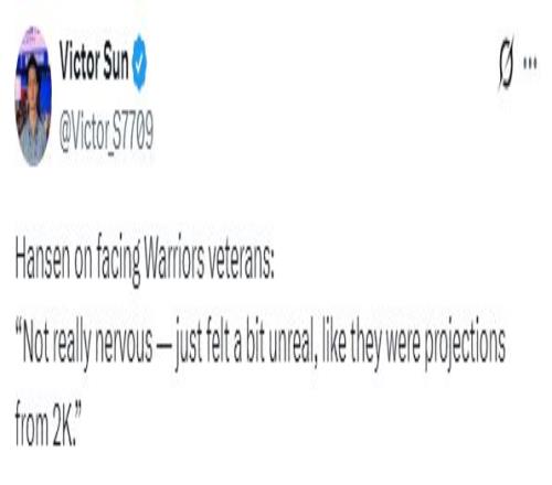 賽后談到首次在賽場上對陣庫里等勇士老將的感受,楊瀚森表示:那倒是不緊張,感覺人有點(diǎn)像是2K里投射出來的。