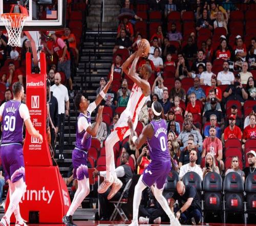 杜蘭特身穿火箭7號球衣亮相,這是他為火箭出戰(zhàn)的第一場比賽,與申京、阿門、小賈巴里-史密斯和謝波德一起首發(fā)出戰(zhàn),杜蘭特登場時滿臉笑容十分開心。
