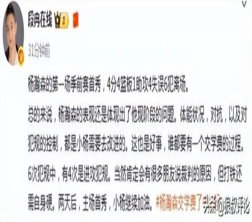 這也是好事,誰都要有一個交學(xué)費(fèi)的過程。6次犯規(guī)中,有4次是進(jìn)攻犯規(guī)。當(dāng)然肯定會有很多朋友說裁判的原因,但打鐵還需自身硬。兩天后,主場首秀,小楊繼續(xù)加油。”