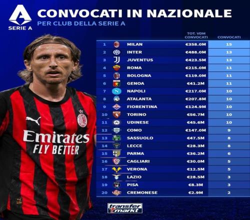 北京時(shí)間10月8日,德轉(zhuǎn)統(tǒng)計(jì)出了意甲球隊(duì)本月國(guó)際比賽日被征召的球員人數(shù),AC米蘭15人得到征召排名第一,國(guó)際米蘭和尤文圖斯則各有13人入選國(guó)家隊(duì)。