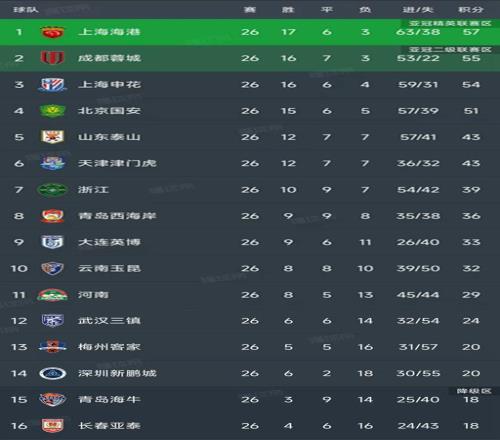 中超最新積分榜