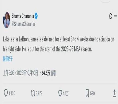 北京時間10月10日凌晨5點,NBA名記Shams報道,勒布朗-詹姆斯因右側坐骨神經痛,至少缺陣3-4周。常規(guī)賽將在10月22日開打,詹姆斯不僅季前賽報銷,還要缺席半個月的常規(guī)賽。這是詹姆斯生涯,第一次缺席常規(guī)賽揭幕戰(zhàn)。