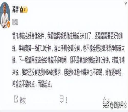 媒體人蘇群發(fā)文點(diǎn)評(píng):曾凡博這么好身體條件,我看籃網(wǎng)都把他注冊(cè)成2米11了,還是需要更好的訓(xùn)練。季前賽第一場(chǎng)打10分鐘,連出手機(jī)會(huì)都沒(méi)有,也不能全怪邊緣球員爭(zhēng)飯碗太獨(dú)。下一場(chǎng)籃網(wǎng)應(yīng)該會(huì)給他差不多時(shí)間,但不是靠加時(shí)賽達(dá)到10分鐘。對(duì)曾凡博來(lái)說(shuō),雖然還沒(méi)有達(dá)到NBA的要求,但這張?bào)w驗(yàn)卡得來(lái)也不容易,好在還年輕,希望這不是終點(diǎn),而是起點(diǎn)。