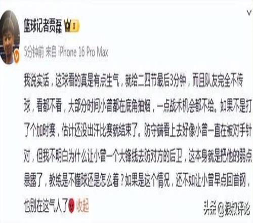 籃球記者賈磊發(fā)文點(diǎn)評(píng):我說(shuō)實(shí)話,這球看的真是有點(diǎn)生氣,就給二四節(jié)最后3分鐘,而且隊(duì)友完全不傳球,看都不看,大部分時(shí)間小曾都在底角抽煙,一點(diǎn)戰(zhàn)術(shù)機(jī)會(huì)都不給。如果不是打了個(gè)加時(shí)賽,估計(jì)還沒(méi)出汗比賽就結(jié)束了。