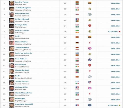 全球19位億元先生:亞馬爾2億歐領(lǐng)銜,登貝萊1億歐登榜,德英未更新