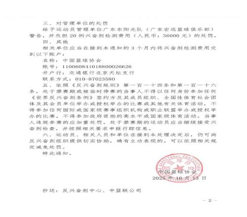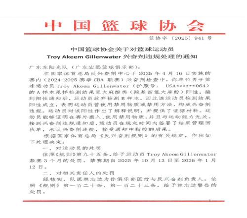 中國籃協(xié)在給廣東東陽光隊(duì)(廣東宏遠(yuǎn)籃球俱樂部)下發(fā)的通知中說:“在國家體育總局反興奮劑中心于2025年4月16日實(shí)施的賽內(nèi)(2024-2025賽季CBA)興奮劑檢查中,你單位男子籃球運(yùn)動(dòng)員Troy Akeem Gillenwater(吉倫沃特)的A樣本尿樣檢測(cè)結(jié)果呈大麻酚類(羧基四氫大麻酚)陽性。接到陽性通知后,運(yùn)動(dòng)員放棄檢測(cè)B樣本,因此該運(yùn)動(dòng)員檢測(cè)結(jié)果陽性成立,表明運(yùn)動(dòng)員曾使用禁用物質(zhì)或禁用方法,構(gòu)成興奮劑違規(guī)。運(yùn)動(dòng)員對(duì)該陽性作出了解釋說明,并提供了證據(jù)材料。運(yùn)動(dòng)員能夠證明在賽外攝入、使用禁用物質(zhì),并且與運(yùn)動(dòng)能力無關(guān)。接到興奮劑違規(guī)通知后,運(yùn)動(dòng)員在規(guī)定時(shí)間內(nèi)簽署了結(jié)果管理回執(zhí)單,承認(rèn)興奮劑違規(guī),接受通知中指控的后果。”
