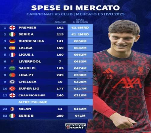 意甲走“量+控本”:引援?dāng)?shù)比英超多(215 vs 162),但總支出僅為三分之一,導(dǎo)致單簽成本顯著更低(558 萬 vs 2222萬歐)。這通常意味著更多免費(fèi)/低價(jià)轉(zhuǎn)會(huì)、租借+買斷、以及瞄準(zhǔn)中低價(jià)段與潛力股。