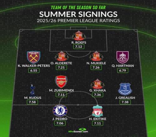 英超7輪戰(zhàn)罷,WhoScored評(píng)出了由今夏新援組成的最佳11人陣容,四名桑德蘭球員入選(數(shù)據(jù)為聯(lián)賽數(shù)據(jù))。
