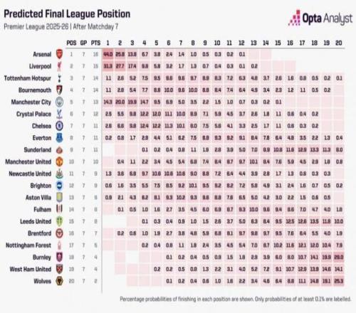 英超七輪過后,數(shù)據(jù)機(jī)構(gòu)OPTA超級(jí)計(jì)算機(jī)預(yù)測(cè)本賽季英超冠軍的