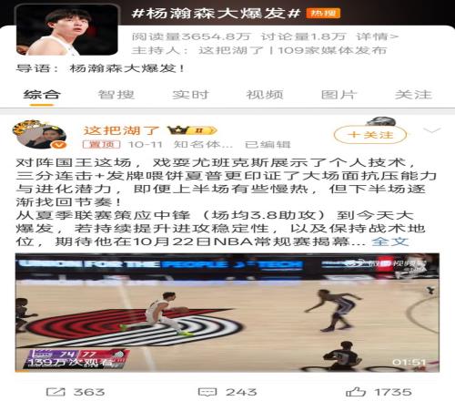 十幾年前,若要了解NBA賽事,中國球迷只有兩個選擇:守在電視機(jī)前等待轉(zhuǎn)播,或是第二天買份報紙查看戰(zhàn)報。如今,當(dāng)楊瀚森在NBA季前賽亮相后,,有球迷曬出自己制作的楊瀚森比賽集錦,有分析師解讀他的技術(shù)特點(diǎn),還有年輕球迷因?yàn)樗谋憩F(xiàn)而開始關(guān)注NBA。