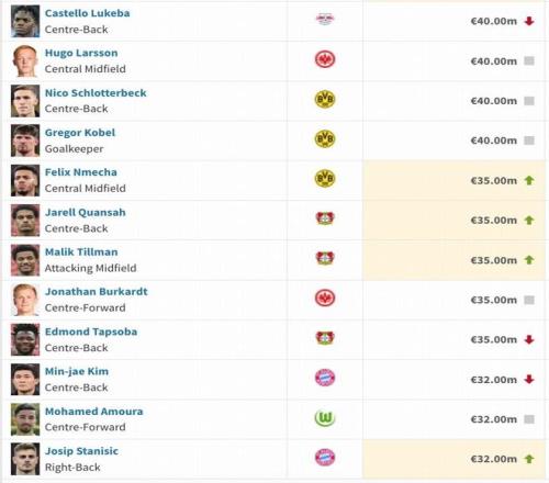 多特蒙德前鋒阿德耶米身價上漲1500萬歐,達到了6000萬歐。法蘭克福前鋒烏尊身價上漲2700萬歐,達到了4500萬歐。拜仁小將倫納特-卡爾身價上漲1850萬歐,達到了2000萬歐,成為了2008年齡段里身價最高的球員。