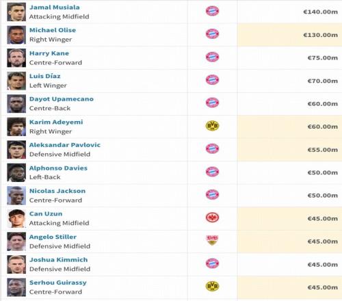 德甲身價更新:奧利塞暴漲3000萬至1.3億歐,穆西亞拉1.4億歐仍居首