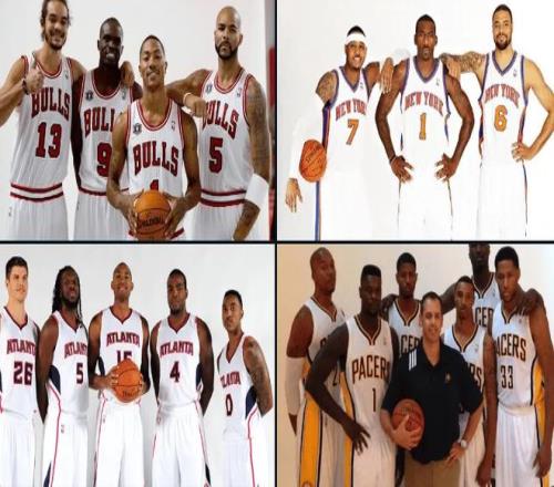 這張圖的四大強隊有:羅斯的超60勝公牛,安東尼、斯塔德邁爾、錢德勒三巨頭尼克斯,跟勇士爭奪常規(guī)賽冠軍且有四大全明星的老鷹,以及喬治、格蘭特、史蒂芬森、韋斯特和“高圓圓”的東決步行者。
