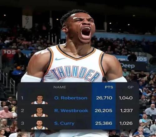 值得一提的是,目前威少NBA生涯總得分為26205分,暫時位列聯(lián)盟史上第20名,高居控衛(wèi)位置第二名,僅落后頭名的奧斯卡-羅伯特森(26710)505分。