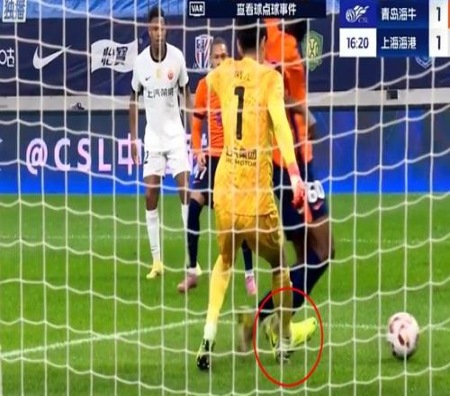 這是一次蔣光太的回傳給門將,但出球的力度有點小,青島海牛前鋒突然從旁邊殺出率先觸球。此時出擊的顏駿凌已經(jīng)出腳,就在他落腳點時候,疑似后腳跟剮蹭到了對手的前鋒(上圖),后者隨即摔倒在地??吹酱饲榇司埃鞑门型醺偖敊C立斷判罰點球!