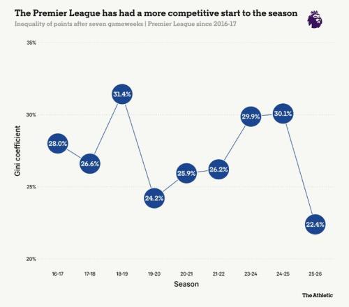 基尼系數(shù)值為100%意味著所有積分都集中在一支球隊(duì)手中,而0則代表完全平等,每支球隊(duì)積分相同。與過去九個(gè)賽季的前七輪相比,本賽季的競(jìng)爭(zhēng)最為激烈,基尼系數(shù)僅為22%。更為激烈的聯(lián)賽增加了比賽在最后階段陷入膠著的可能性,為補(bǔ)時(shí)階段的戲劇性轉(zhuǎn)折創(chuàng)造了條件。