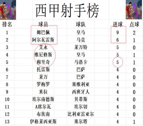射手榜方面,姆巴佩9球穩(wěn)居榜首,阿爾瓦雷斯6球位列第2。穆里奇今天打入一球,追上維尼修斯,艾永5球并列第3。萊萬今天缺陣,和托雷斯,A席爾瓦,羅梅羅等人4球擠入前十。