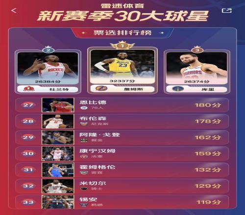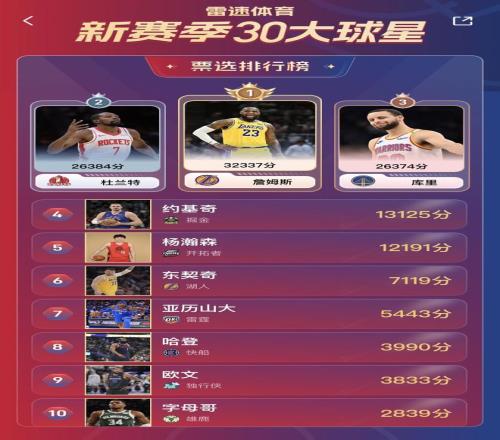 雷速NBA30大球星即時排名:詹姆斯穩(wěn)坐頭名,杜蘭特庫里伯仲之間,楊瀚森第5