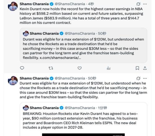 杜蘭特本有資格獲得一份為期兩年、價值1.2億美元的頂薪續(xù)約合同,但他在選擇火箭隊作為交易目的地時就明白,他將在新合同中犧牲一部分薪水——在這種情況下大約是3000萬美元——這樣雙方可以長期合作,并為球隊在陣容建設上提供靈活性。