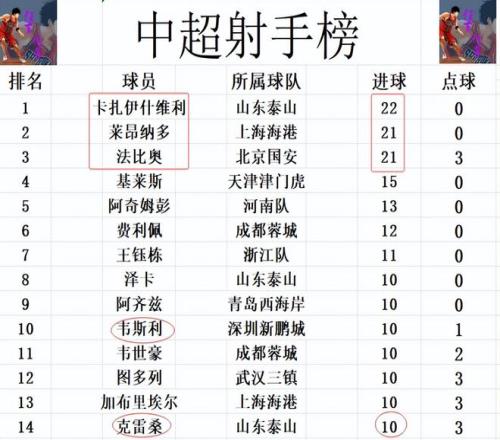 射手榜方面,卡扎伊什維利22球繼續(xù)領(lǐng)跑,法比奧昨晚無力破門,還是和萊昂納多差榜首1球并列第2?;R斯15球排在第4,阿奇姆彭13球位列第5??死咨|c(diǎn)射,韋斯利傳射建功,兩人追上澤卡,韋世豪等人10球剛好擠入前十。