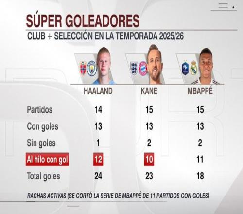 歐冠聯(lián)賽階段第三輪,哈蘭德、凱恩延續(xù)了連場進球的紀(jì)錄,而姆巴佩則停留在11場。