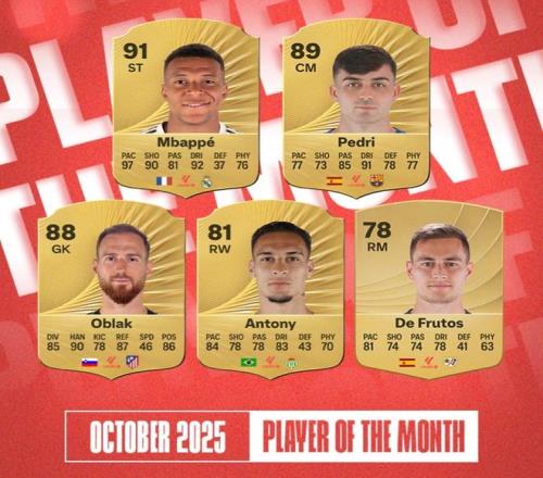 雷速體育10月22日?qǐng)?bào)道宣稱 西甲官方公布了10月最佳球員的五位候選人,姆巴佩連續(xù)三個(gè)月進(jìn)入提名,佩德里、安東尼在列。