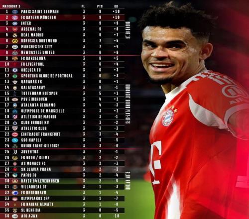 歐冠聯(lián)賽階段前3輪過(guò)后,拜仁三戰(zhàn)全勝,打進(jìn)12球丟2球,僅因進(jìn)球數(shù)的劣勢(shì)暫列第二。目前排名第一的則是同樣三戰(zhàn)全勝,打進(jìn)13球丟3球的巴黎。