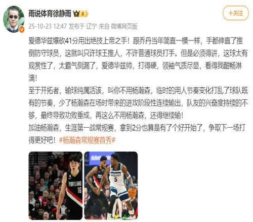 徐靜雨表示:加油楊瀚森,生涯第一戰(zhàn)常規(guī)賽,拿到2分也算是有了個(gè)好開始了,爭(zhēng)取下一場(chǎng)打得更好吧!