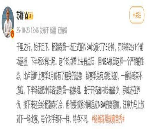 蘇群表示:千里之行,始于足下。希望他抓緊時(shí)間適應(yīng)NBA的高強(qiáng)度,注意力馬上放到下一場(chǎng)比賽。