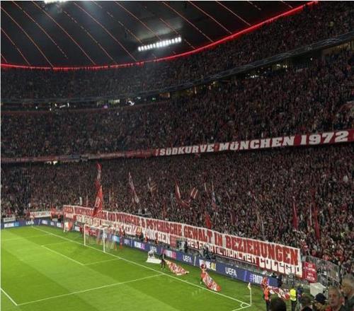 在拜仁對陣布魯日的比賽開賽前不久,安聯(lián)球場的球迷們舉起了一條橫幅,上面寫著“反對權(quán)力濫用以及在關(guān)系中的身體和心理暴力” 。