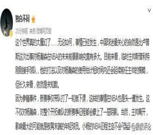 青島記者杜金城發(fā)文點評:這個世界真的太魔幻了……無論如何,事情已經(jīng)發(fā)生,中國球迷最關(guān)心的自然是比盧普斯這次出事對楊瀚森在NBA的未來前景影響究竟有多大。