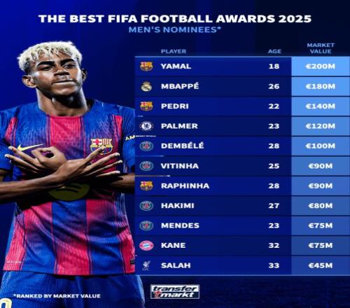 FIFA最佳球員候選身價:亞馬爾2億領跑薩拉赫凱恩墊底