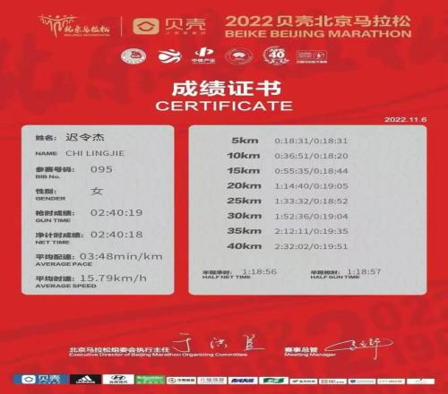 “那是我人生中,我認為最全力以赴的一場跑步。”她回憶道。遲令杰在最后一百米的沖刺中,硬是跑贏了馬拉松名將李美珍,最終,她的沖線成績定格在2小時34分。