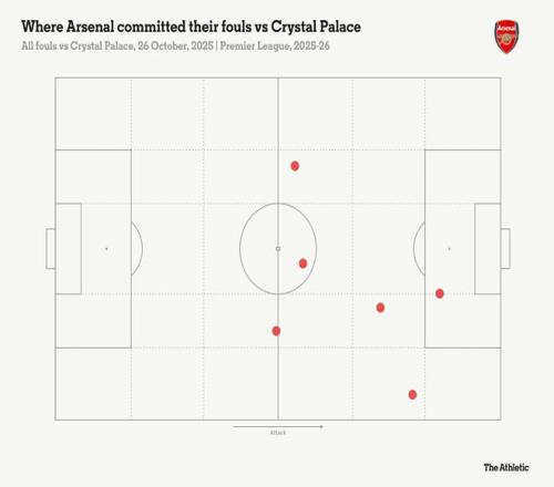 下圖中的圓點(diǎn)標(biāo)示了阿森納在該場比賽中犯下6次犯規(guī)的位置。所有這些犯規(guī)都發(fā)生在水晶宮的半場。