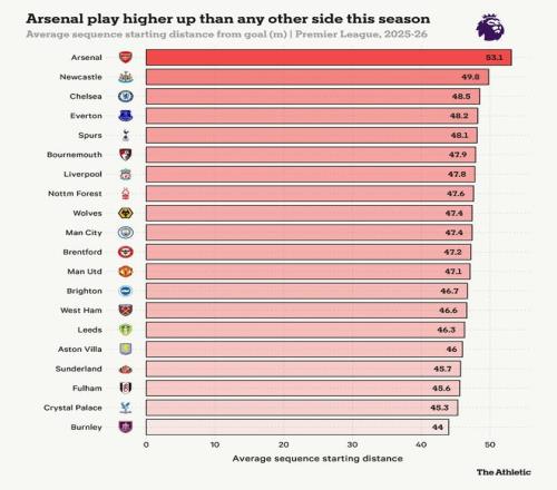 阿森納的紀(jì)律記錄也有其結(jié)構(gòu)性因素,例如他們陣型前壓的程度。他們的平均進(jìn)攻序列起點(diǎn)——Opta 將“進(jìn)攻序列”定義為 “某一隊(duì)連續(xù)控球的進(jìn)攻過程,以防守動(dòng)作、比賽中斷或射門結(jié)束”——達(dá)到53.1米,是英超所有球隊(duì)中最高的。