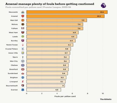 阿森納目前平均每10.2次犯規(guī)才吃到一張黃牌——只有紐卡斯?fàn)柭?lián)(10.6)在未受警告的情況下犯規(guī)次數(shù)更多。在英超最近一輪1-0戰(zhàn)勝伯恩利的比賽中,加布里埃爾是唯一吃到黃牌的阿森納球員。他的犯規(guī)原因?一次在本方禁區(qū)邊緣試圖奪回球權(quán)時(shí)過于激進(jìn)的上搶。