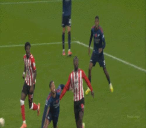第45+2分鐘,阿森納將球傳到禁區(qū)內(nèi),薩卡頭球回做,無(wú)人盯防的薩利巴一腳抽射打高,錯(cuò)失扳平良機(jī)。